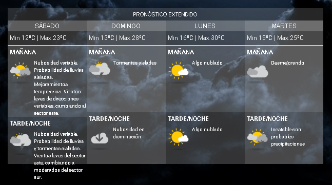 La jornada se presentará con nubosidad variable, probabilidad de lluvias aisladas, vientos leves de direcciones variables, cambiando al sector este y rotando por la tarde-noche al sector sur.