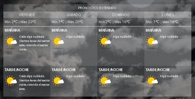 Para el fin de semana, se esperan máximas que oscilan entre los 20 y 16 grados mientras que el próximo lunes, vuelve a bajar a 14ºC. Las mínimas en esos días irán de los 2 a -1ºC.