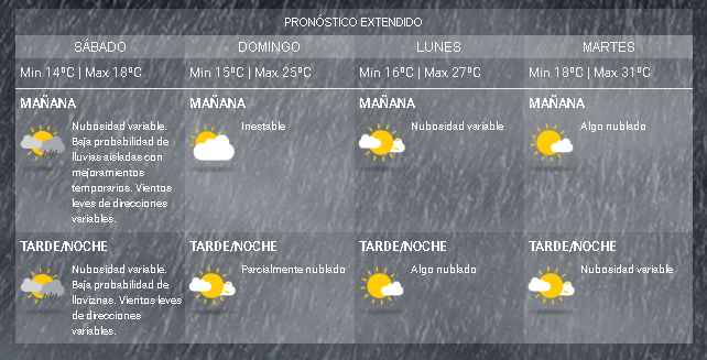 Para el domingo, la máxima trepará hasta los 25ºC mientras que en el inicio de semana, se espera que oscile entre los 27 y 31 grados.