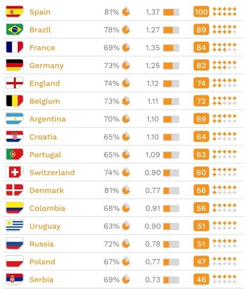 De acuerdo con el índice que crearon, que combina el porcentaje promedio de partidos jugados de liga de cada uno de los 23 futbolistas más utilizados por cada país en las Eliminatorias con el promedio del nivel de sus clubes, el combinado de Julen Lopetegui es el mejor preparado para la Copa del Mundo.