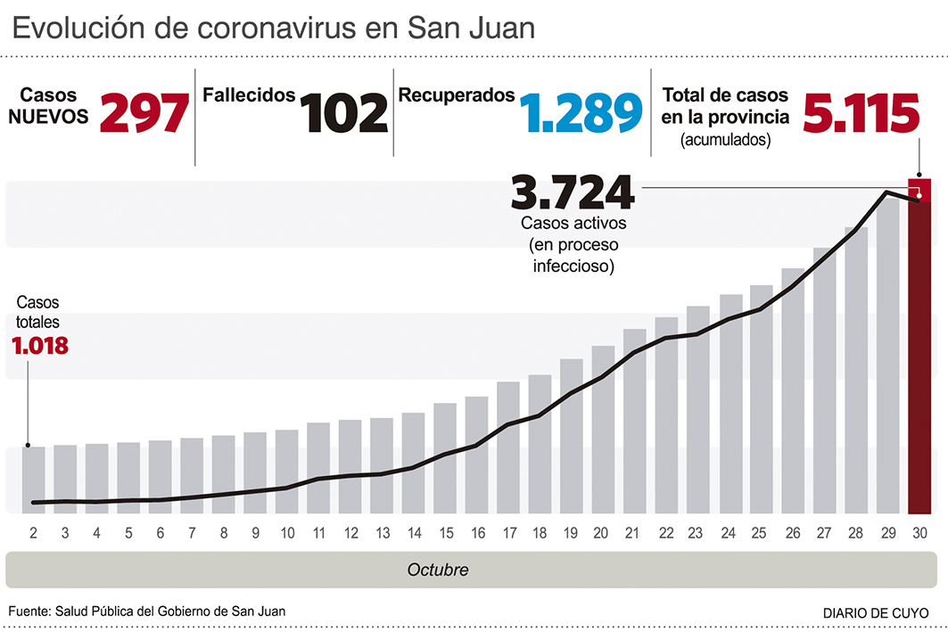 A nivel provincia, la variación fue también notoria pues para el 16 de octubre, Salud Pública informaba 96 positivos y para el 29, el acumulado era de 2.991; es decir, 31 veces más y con un promedio de 213 casos por día.