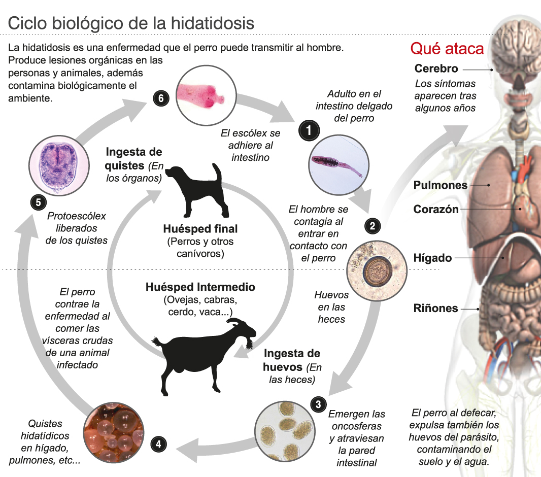El equipo de Salud empezó el chequeo en las escuelas del departamento Sarmiento y continuarán en Caucete la próxima semana. Lo que quieren es controlar a los chicos ya que cuando recién se contrae esta enfermedad no tiene síntomas. Recién en la adultez comienzan a ser visibles sus indicios. Entonces, en general, a esa edad la única solución es la intervención quirúrgica. Verónica Pérez, al frente de Zoonosis de Salud Pública explicó que el control se hace en niños de zonas rurales porque es allí donde se dan las prácticas más riesgosas para que la enfermedad se transmita. Es decir que en el campo, luego de la faena de animales, se les dan las vísceras a los perros y estos, que pueden contraer la bacteria, están en contacto con los niños y ahí está el riesgo de transmisión (ver infografía).