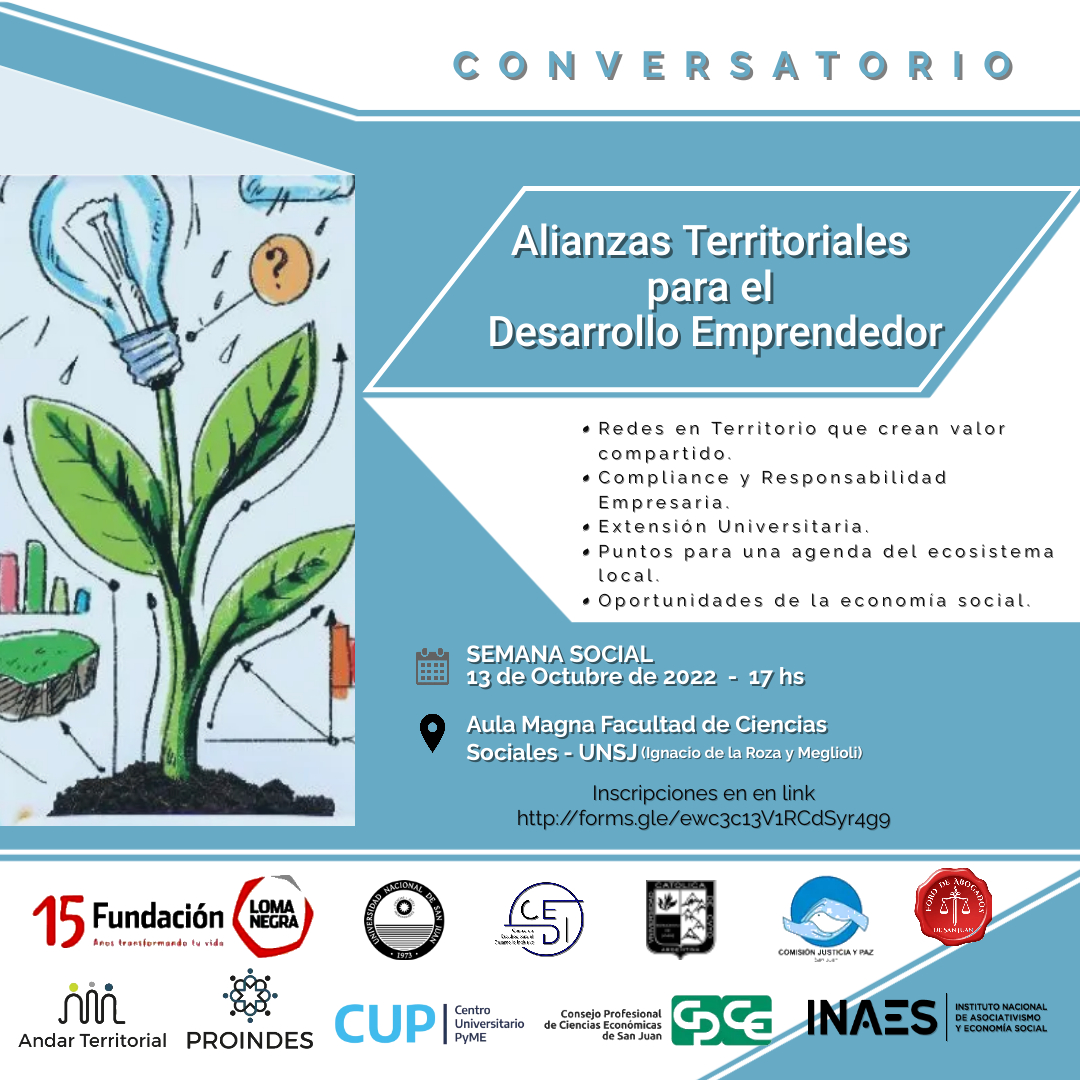 Se viene el conversatorio ‘Alianzas Territoriales para el Desarrollo Emprendedor’ este 13 de octubre, a las 17 horas, en Aula Magna FACSO – UNSJ (Ignacio de la Roza y Meglioli), en el marco de la Sema Social.