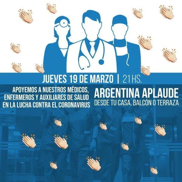 Al igual que sucedió en España e Italia, una iniciativa que se viralizó en las redes sociales, bajo el lema "Argentina aplaude", convoca a todos los vecinos a asomarse a sus ventanas, balcones o terrazas este jueves 19 a las 21, para unirse en un "apuausazo" destinado a reconocer el trabajo y sacrificio de todos los médicos, enfermeros y auxiliares de la salud que luchan contra el coronavirus.