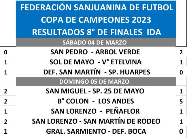 Además, en 25 de Mayo, Juvenil San Lorenzo se impuso por 2-1 sobre San Martín de Rodeo, en Ullum Barrio Colón sufrió un duro golpe al caer por 5-2 ante Los Andes de Tudcum, el mejor equipo de la fase clasificatoria y finalmente Atlético General Sarmiento le ganó 1-0 en el clásico a Defensores de Boca.