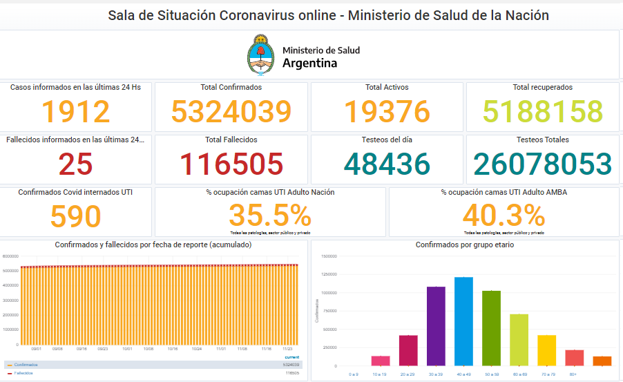 El reporte del Ministerio de Salud confirmó 1.912 nuevos contagios en las últimas 24 horas. Con estos registros, suman 5.324.039 casos desde que comenzó la pandemia. Además, se registraron 25 nuevas muertes de pacientes con coronavirus lo que eleva la cifra de víctimas mortales en el país a 116.505.