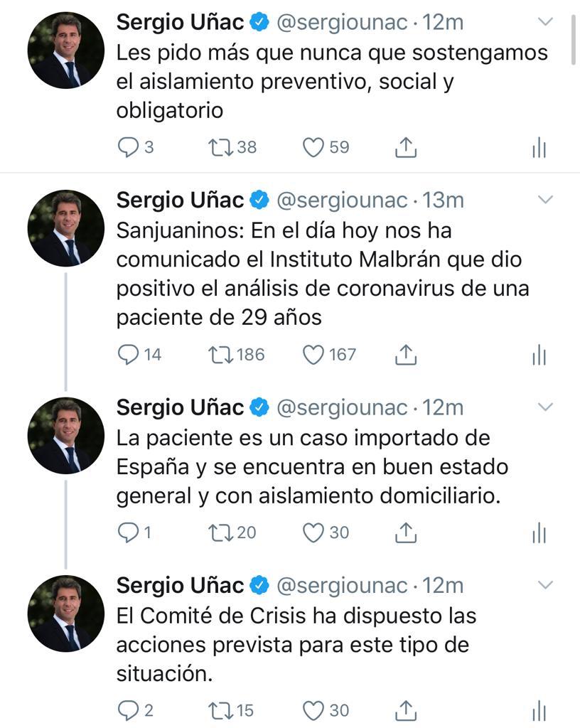 "Sanjuaninas y sanjuaninos, en el día de hoy nos ha comunicado el Instituto Malbrán que dio positivo el análisis de coronavirus de una paciente joven de 29 años atendida en el Hospital Rawson", informó a través de su cuenta de Twitter el gobernador Sergio Uñac.