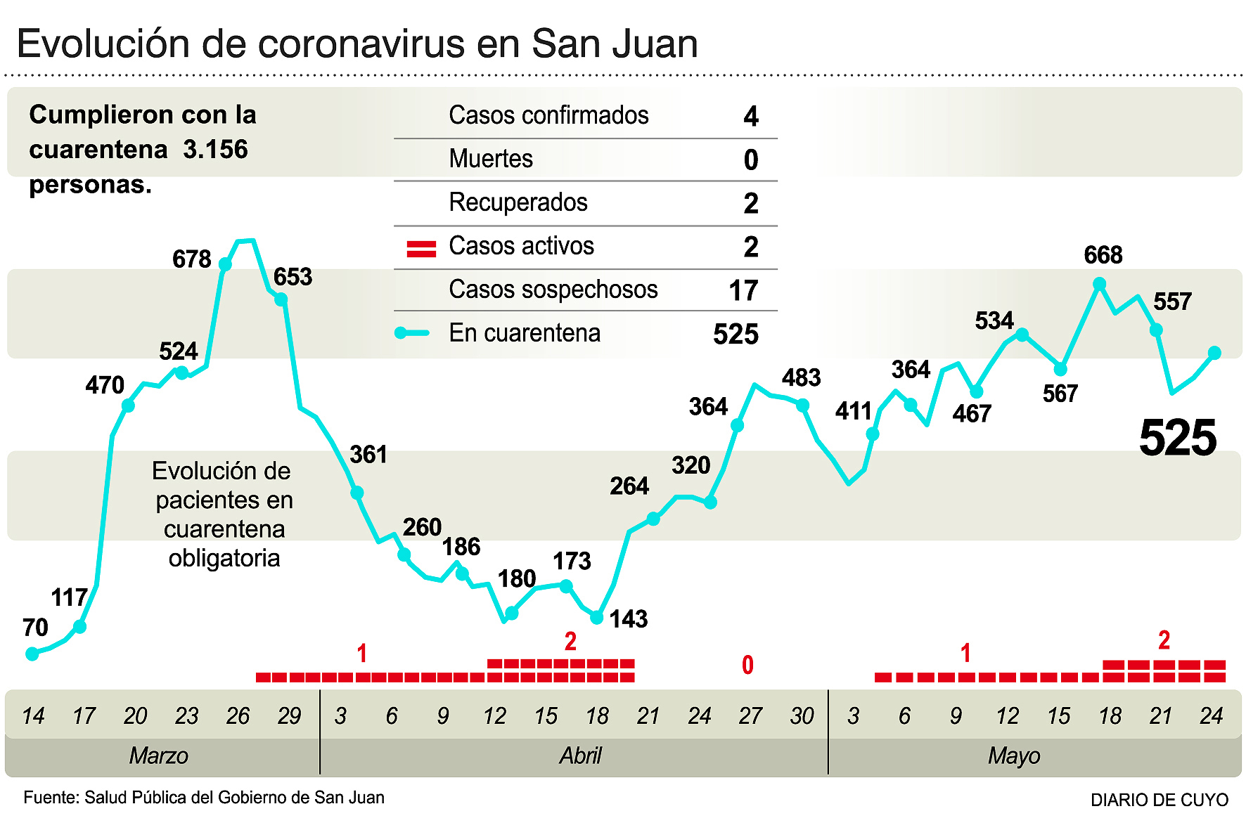 Ayer por la tarde, el Ministerio de Salud Pública de San Juan emitió su parte diario sobre la situación del coronavirus en la provincia y, hasta las 18:00 no se habían registrado nuevos casos positivos. En tanto que aún hay solo dos casos confirmados, que es del transportista que regresó desde Buenos Aires y su hermana médica. Ambos evolucionan favorablemente, según la información proporcionada por el Gobierno de la provincia.