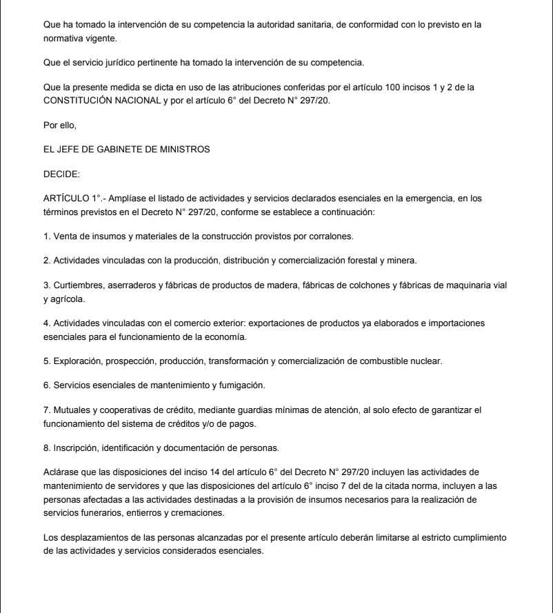 Tras ver los efectos económicos de dos semanas de parate total, se tomó esta determinación. “La realidad de la implementación del aislamiento social, preventivo y obligatorio ha demostrado la necesidad de incorporar otras actividades y servicios con carácter de esenciales con el fin de mitigar los efectos ocasionados por las medidas adoptadas”, se argumentó entre los considerandos del anuncio, que llevó las firmas del jefe de Gabinete, Santiago Cafiero, y del Ministro de Salud, Ginés González García.