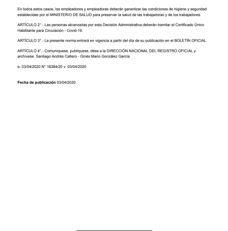 “Los desplazamientos de las personas alcanzadas por el presente artículo deberán limitarse al estricto cumplimiento de las actividades y servicios considerados esenciales”, aclaró el Gobierno quien remarcó que “en todos estos casos, los empleadores y empleadoras deberán garantizar las condiciones de higiene y seguridad establecidas por el Ministerio de Salud para preservar la salud de las trabajadoras y de los trabajadores”.