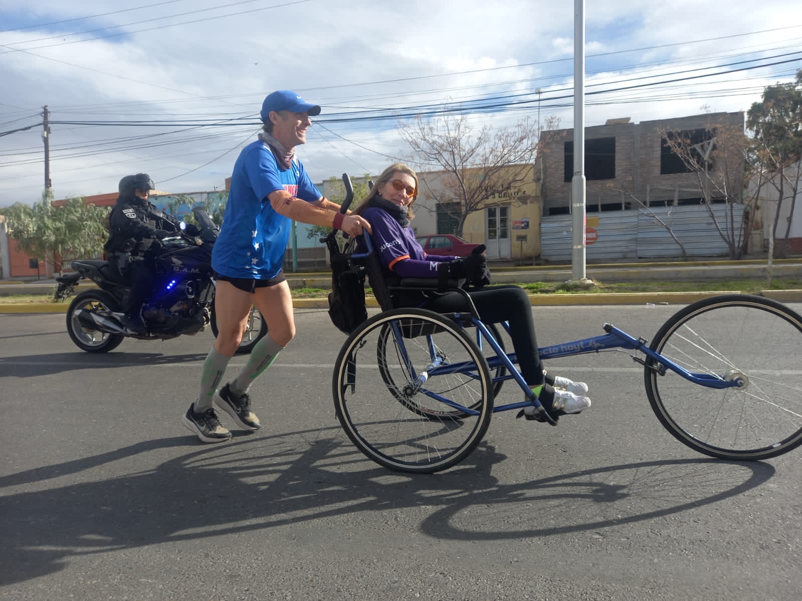 Lorena Portillo en su juventud hizo deportes pero hace unos años un accidente le cambió la vida y hoy su rutina depende pura y exclusivamente de su silla de ruedas. Pensó que después de eso sería imposible volver a sentir la adrenalina que genera una competencia pero no fue así. El domingo cuando atravesó el arco de llegada en la Maratón de San Juan explotó de emoción. Claro que nada hubiese sido posible sin ayuda de Juan Carlos Manzano.