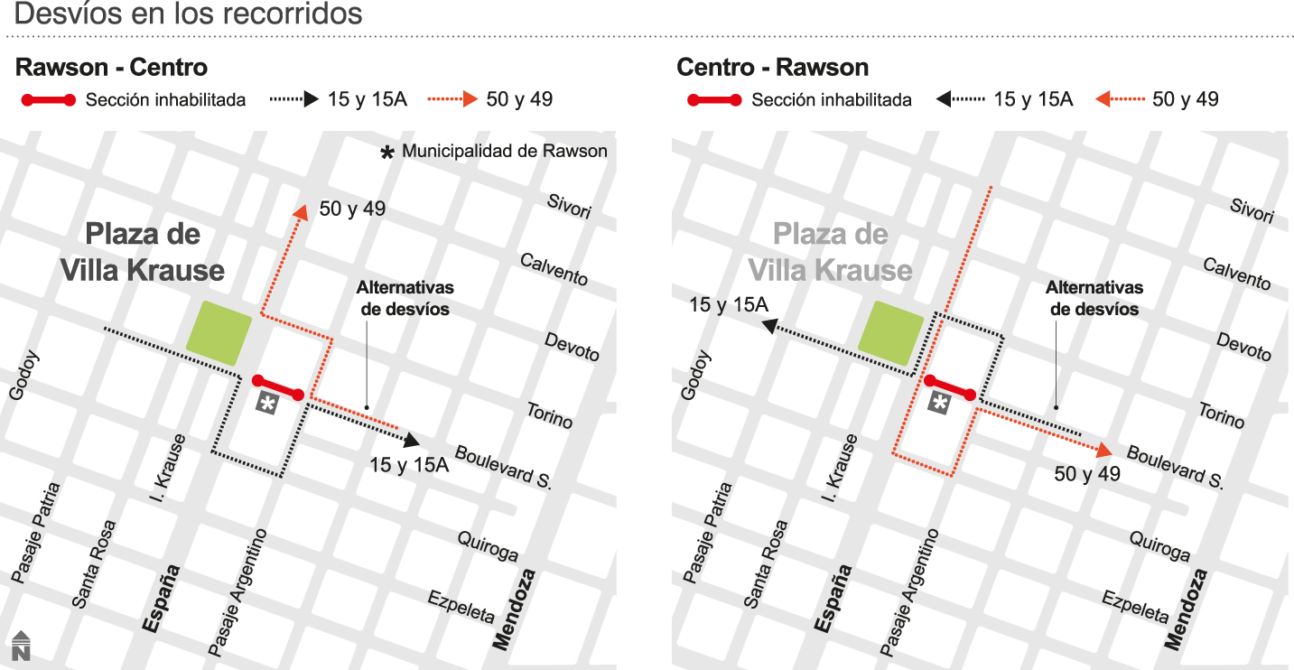 Esta interrupción de tránsito abarca sólo una cuadra, pero genera varios inconvenientes, especialmente en la intersección de Boulevard y Pasaje Argentino, donde no hay semáforo, y por donde ahora deben circular las líneas 50, 49, 15 y 15A que van desde Rawson al centro y viceversa. A esto se suma que sobre Pasaje Argentino, entre Boulevard y Torino, se encuentran los cajeros del Banco San Juan y la gente acostumbra a estacionar en doble fila para ingresar a los mismos. "Ahora es imposible que haya un auto parado en doble fila en este sector porque dificulta el paso de los colectivos y demás vehículos de gran porte. Por eso estamos ordenando el tránsito en esta zona en forma permanente para evitar inconvenientes. También nos encargamos de decirle a la gente dónde debe tomar el colectivo", dijo Esteban Ortiz, inspector del área de Seguridad Vial de la Municipalidad de Rawson.