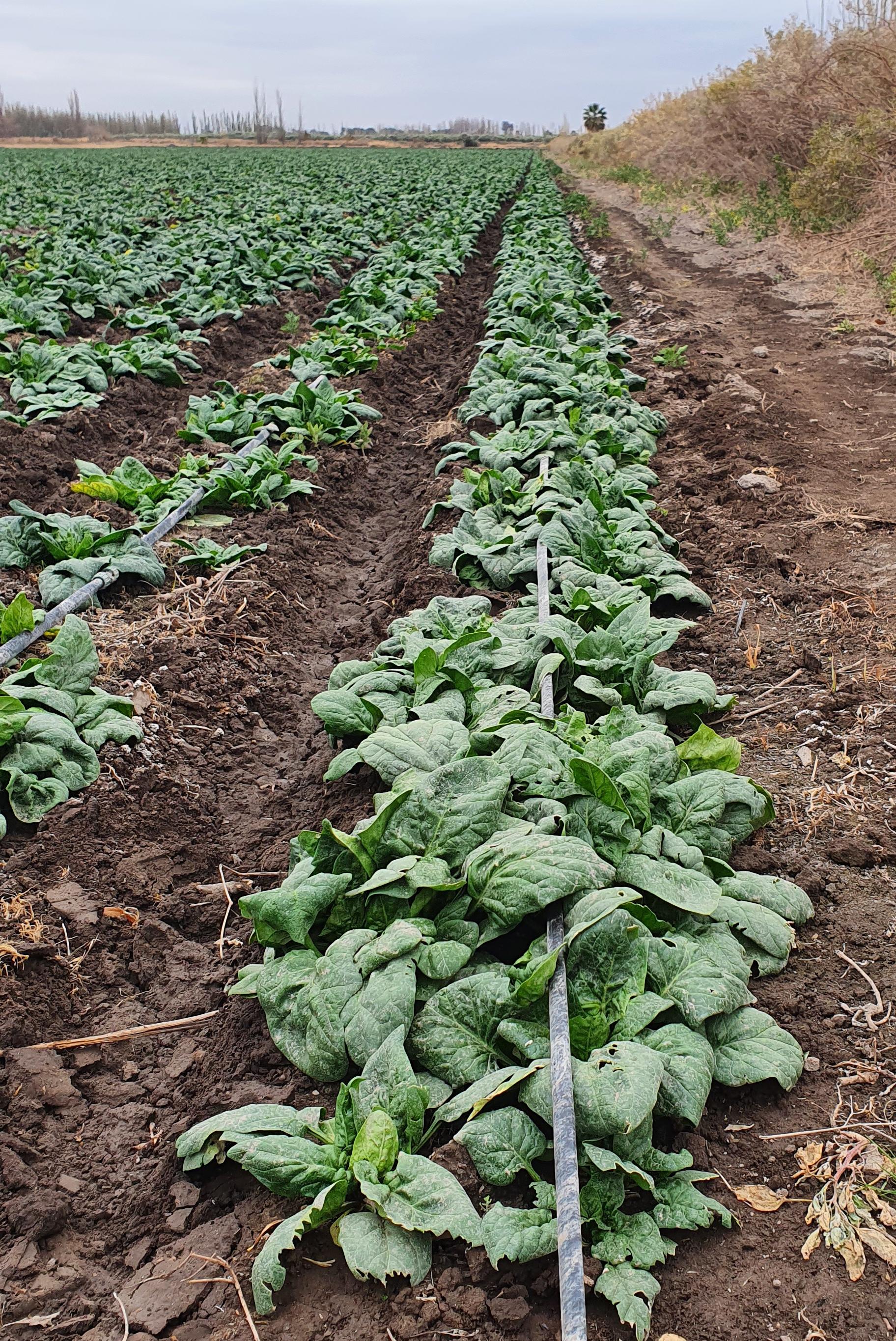 Iván García, en sus 5 hectáreas de espinacas, sobre calle 9, pasando Tascheret, Rawson, comentó "es un complemento de los tomates de verano, se cosecha con máquina, hay contrato y seriedad de por medio. El problema es la escardillada, con gente, que es cara. Pero la primera y segunda corta se llevan, la tercera la enterrás, y eso es bueno para la tierra".