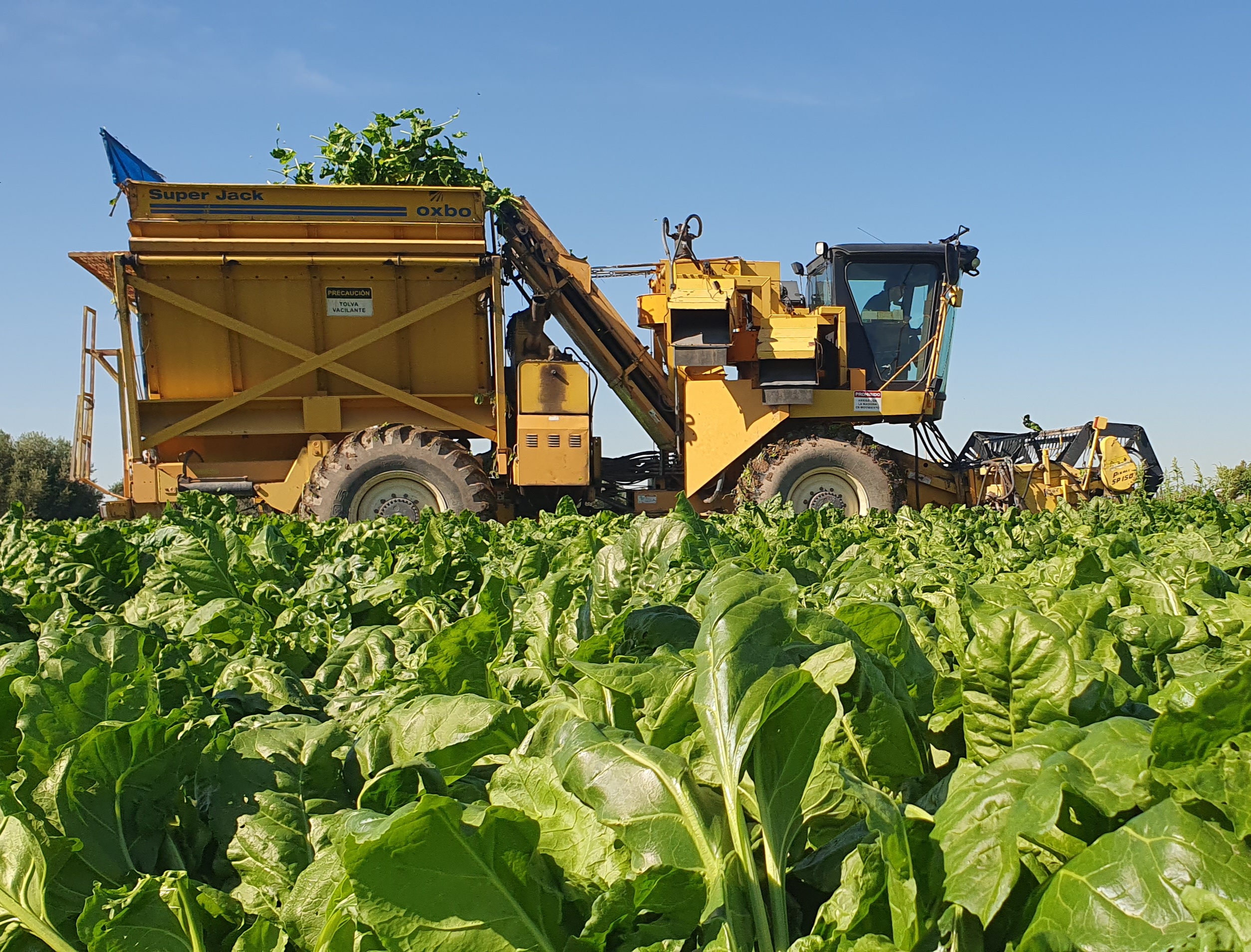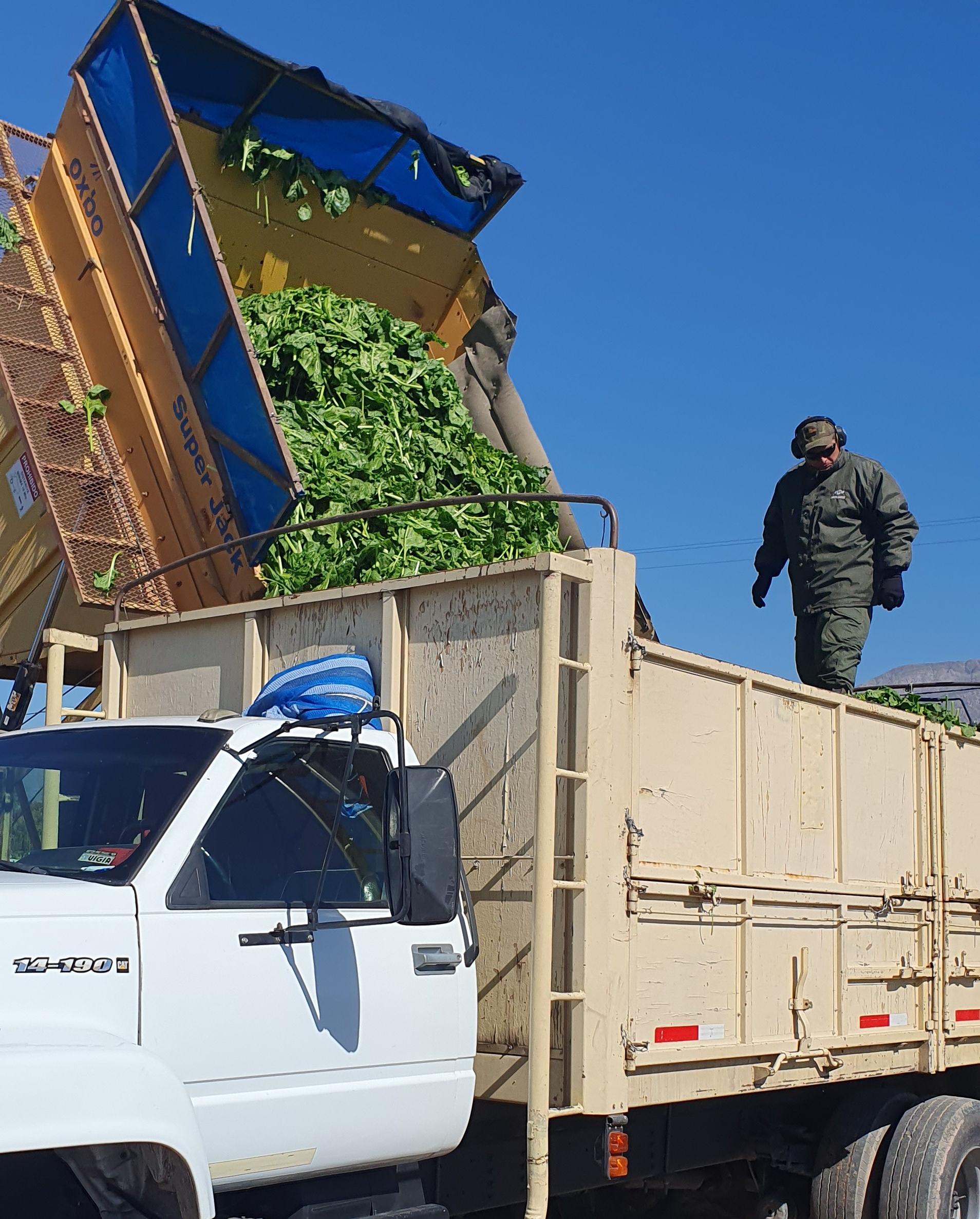 La intención es poder cosechar casi todo el año acelga, hasta noviembre. Con recolección mecánica, dos choferes se encargan de la cosechadora marca Oxbo, modelo Super Jack, aseguraron que es muy fácil llevarla, y haciéndole cambios en partes de la plataforma se puede recolectar maíz, chauchas, habas y otras especies de hortalizas.