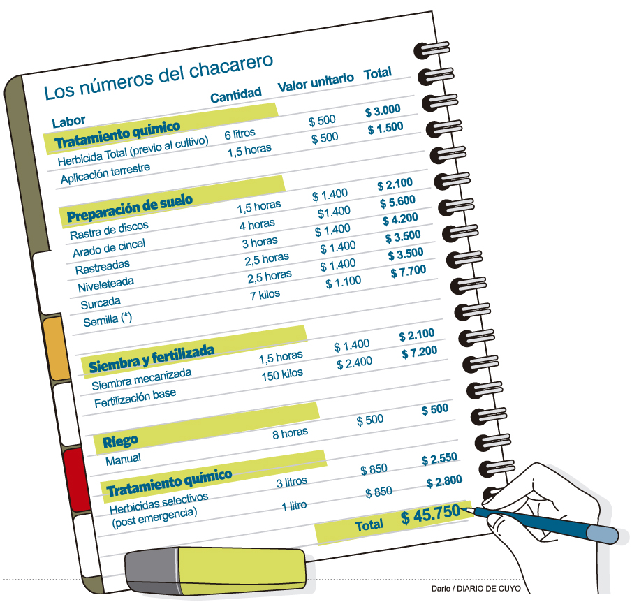 Hay que aclarar, que algunos productores informaron que utilizan su propia simiente, que obtienen de un par de líneas hechas en su finca, junto a otros cultivos forrajeros y hortícolas, como también membrillos y olivos, que algunos poseen. Por eso el (*) en la infografía. Otros compran la semilla, habiendo innumerables valores según sean originarias de un familiar (algo muy común), o una cooperativa, o Fecoagro Ltda, o si la adquieren en San Juan, a algún agricultor inscripto en Inase, Asprosem, y que cumple con la Ley Provincial de Semillas, que tienen un valor extra de calidad, en cuanto a poder germinativo, vigor, sanidad y por todo ello, poseen un mayor precio final.