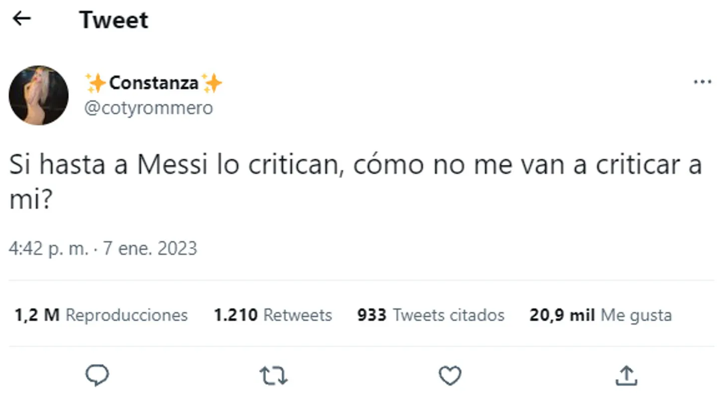 Coti Romero se convirtió en una de las participantes de Gran Hermano (Telefe) más polémicas de todas. En las últimas horas, la correntina publicó el siguiente tuit: “Si hasta a Messi lo critican, ¿cómo no me van a criticar a mí?”. Fue entonces que los usuarios no tardaron en mostrarse indignados por la frase que lanzó la exparticipante y la atacaron duramente.