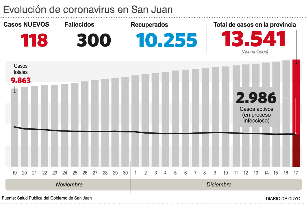 Con tres nuevos decesos, San Juan llegó ayer a los 300 fallecidos a causa de Covid, de acuerdo a lo que informó el Ministerio de Salud Publica. Además, reportaron 118 casos y los contagios ascienden a 13.541.