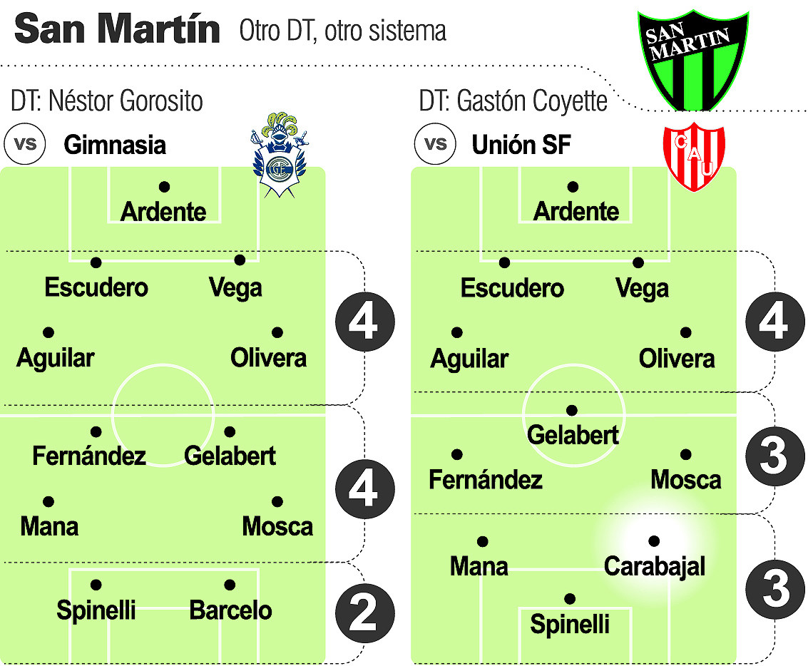 Al 4-3-3 que lo llevó a revolucionar la B Nacional con Chacarita, para ascenderlo a Primera el año pasado, buscará darle continuidad en San Martín y todo indica que ante Unión irá con Ardente; Aguilar, Escudero, Vega, Olivera; Fernández, Gelabert, Mosca; Mana, Spinelli, Carabajal.