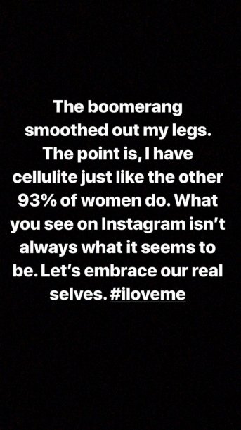 A estas imágenes le siguió otra grabación de espaldas, frente al espejo, luciendo unos mini shorts que dejaban a la vista sus piernas y su cola: “El boomerang alisó mis piernas – aclaró sobre el efecto-. El punto es que tengo celulitis al igual que el otro 93% de las mujeres”.