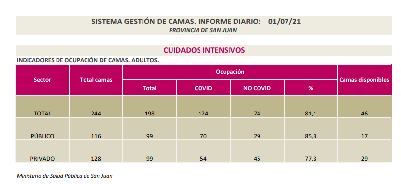 Se encuentran 242 internados pacientes en las áreas de COVID-19 (entre positivos y sospechosos) de los hospitales Dr. Guillermo Rawson; Dr. Marcial Quiroga; Dr. Ventura Lloveras, de Sarmiento; Dr. César Aguilar, de Caucete; Dr. José Giordano, de Albardón; Dr. Federico Cantoni, de Pocito; CEMEC; Dra. Julieta Lanteri; Hospital San Roque, de Jáchal; Hospital Dr. Alejandro Albarracín, de Valle Fértil; Hospital de Barreal, de Calingasta; Hospital Privado; Instituto Médico; Clínica El Castaño; Clínica Santa Clara; Sanatorio San Juan y CCI.