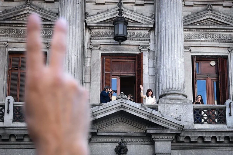 Ataviada con un traje color beige y camisa blanca, la expresidenta y actual titular de la Cámara alta se asomó durante algunos minutos al balcón de su oficina para saludar a los cientos de manifestantes que se agolparon en la vereda de la avenida Callao, a la altura de Hipólito Yrigoyen, para expresarle su apoyo.