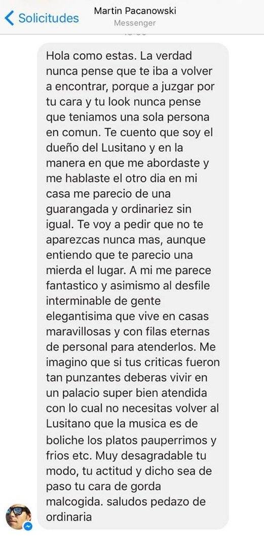 "La manera en que me abordaste y me hablaste el otro día me pareció de una guarangada y una ordinariez sin igual. No necesitás volver al Lusitano, ya que la música es de boliche, los platos fríos, paupérrimos, etc.", le escribió Martín Pacanowski