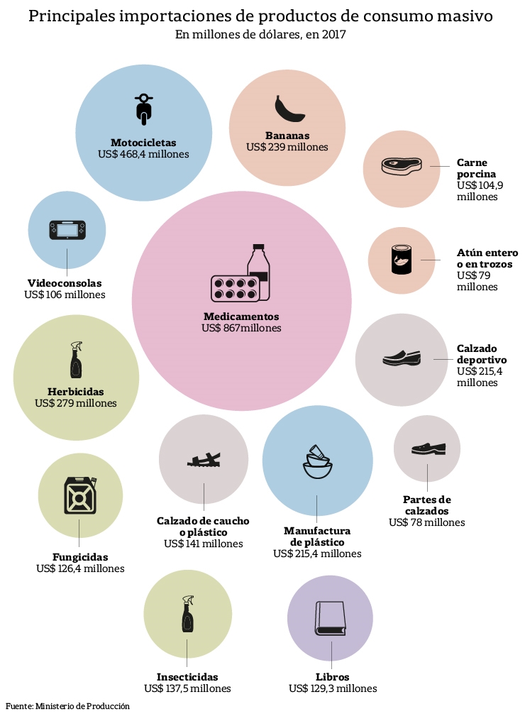 Se trata principalmente de los bienes importados, entre los que se cuentan variedades muy cercanas al gusto y a las necesidades del consumidor argentino que van desde remedios, bananas y carne de cerdo hasta motos, atún en lata y consolas de videojuego, para citar algunos ejemplos.