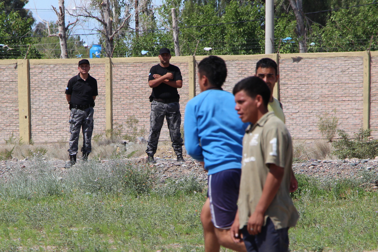 Mientras se escucha cumbia de fondo que llega desde las celdas cercanas, el jefe de Coordinación Deportiva del Penal, Darío Atencio, pide refuerzos de distintas divisiones que, armadas y con movilidades de apoyo, se paran en puntos estratégicos alrededor del campo de juego.