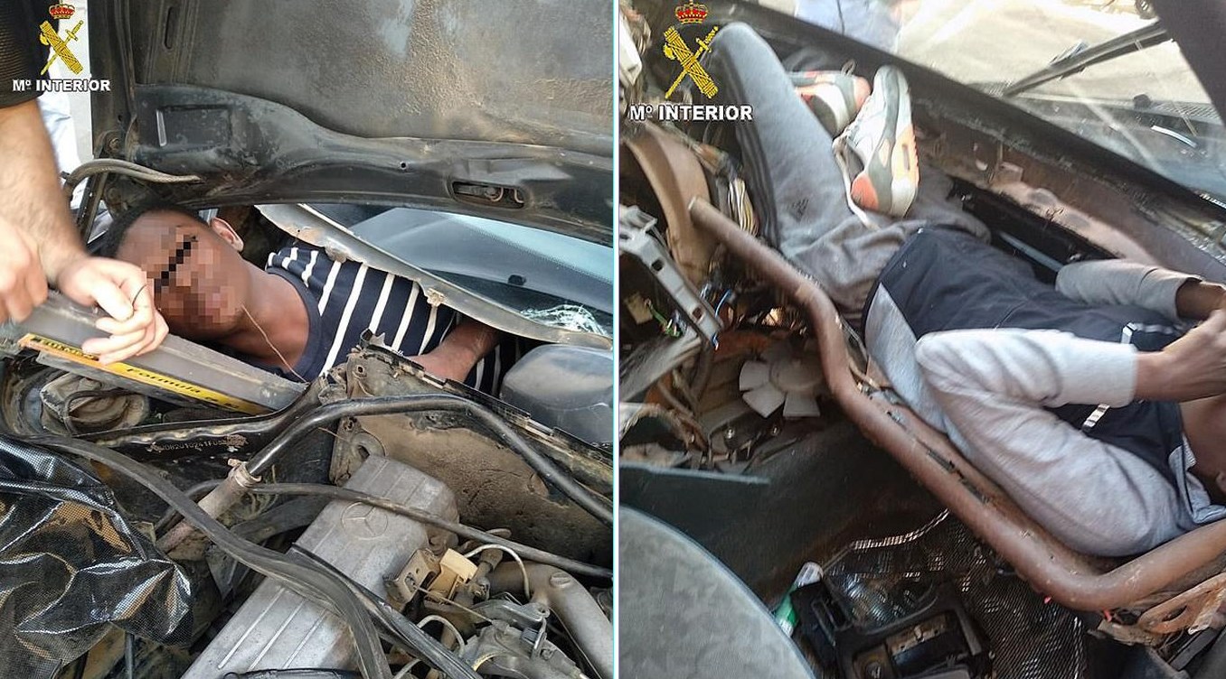 Según el informe de los efectivos de la Guardia Civil, los jóvenes viajaban contorsionados en los recovecos menos pensados. El primero, de unos veinte años, iba apretado detrás del tablero de uno de los autos. El segundo, dentro del compartimiento del motor. El tercero fue encontrado detrás de los asientos traseros de otro de los vehículos, y el cuarto se desplazaba en una posición peligrosa dentro de un camión volquete.