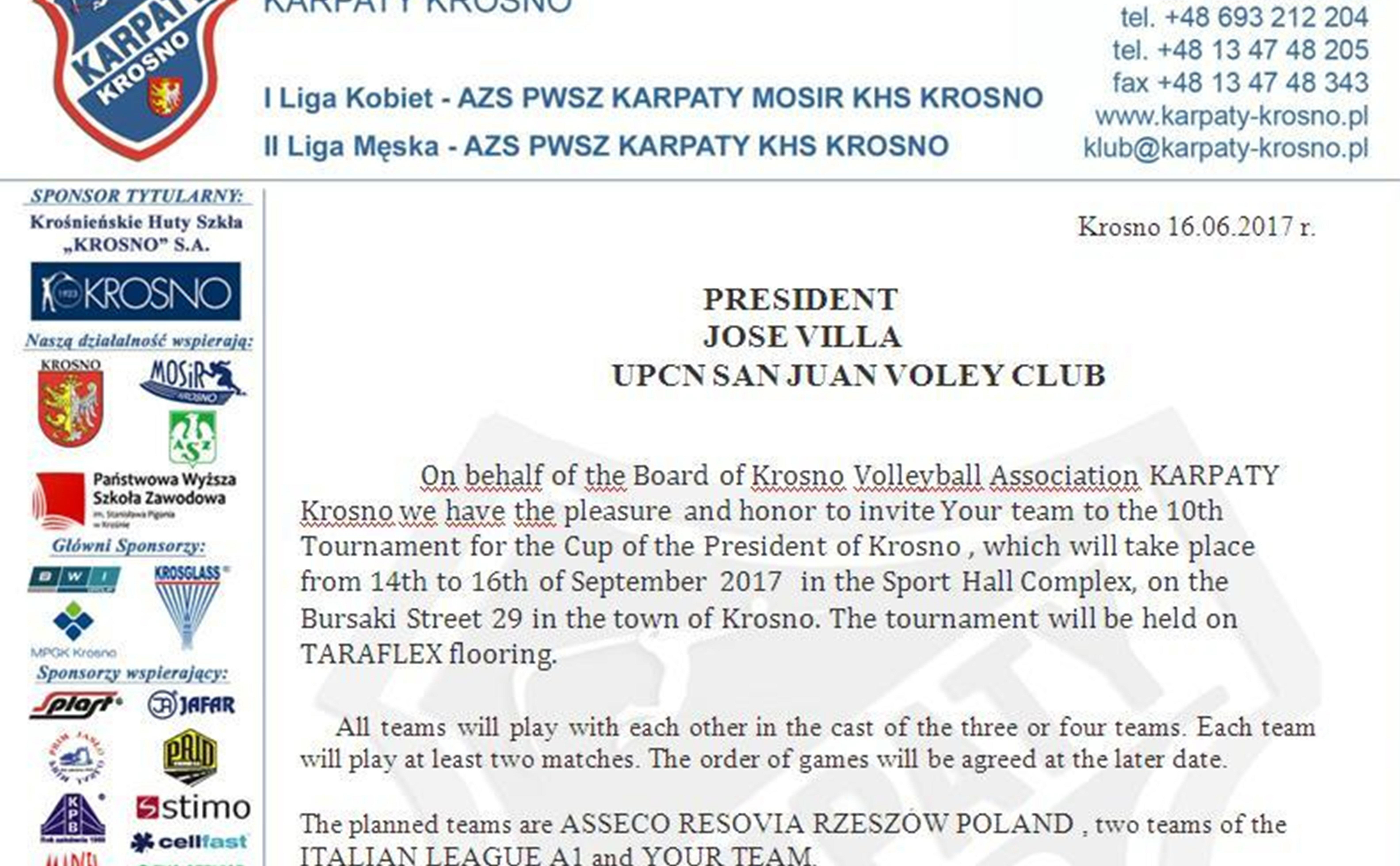 Este es una captura de la invitación de que recibió UPCN San Juan Voley por parte de la Karpaty Krosno, la Asociación de Vóleibol de Krosno, para participar del torneo. La Cup of the President of Krosno se disputará en el Sport Hall Complex, que es el estadio cubierto del lugar.
