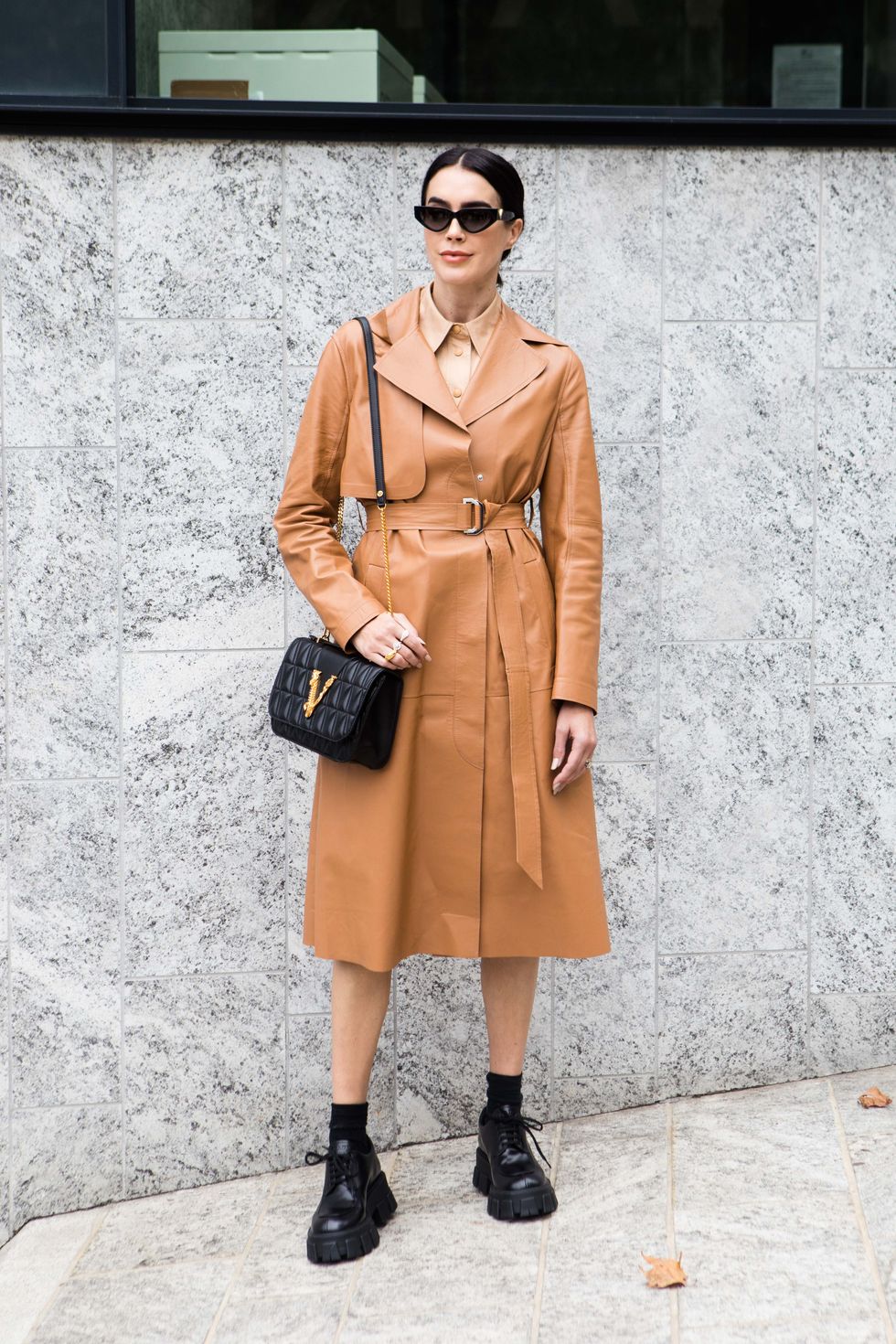 Abrigo de cuero estilo gabardina en color camel con accesorios en color negro, imposible un minimalismo tan efectivo como este.