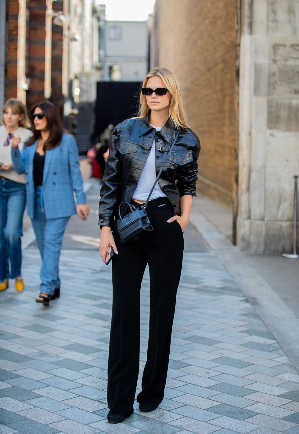 La influencer Leonie Hanne luce unos pantalones de cuero con cropped top a juego y americana blanca. Aporta el toque de color con los accesorios en color azul.