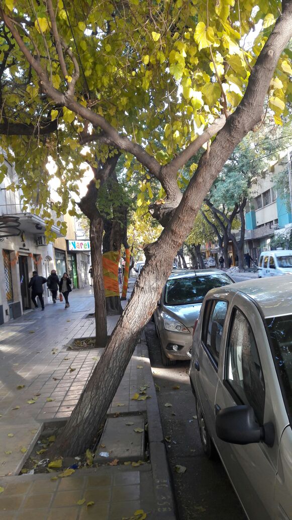 Un lector envió una imagen y el siguiente comentario: "Este árbol torcido está en inmediaciones de calle Entre Ríos y Laprida. Está inclinado, pareciera a punto de caerse, que la Municipalidad haga algo antes que ocasione un daño".