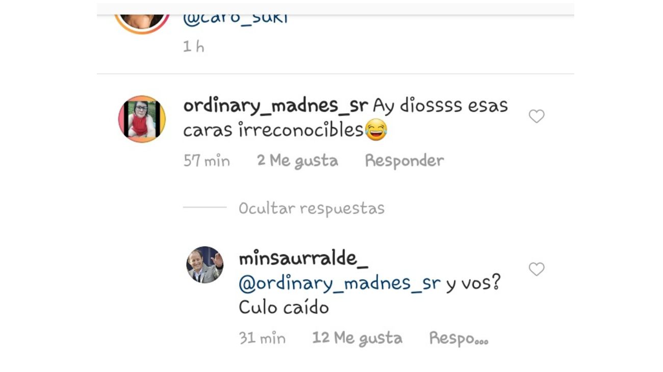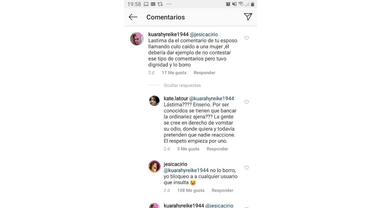 "Ay, Dios. Esas caras irreconocibles", indicó la hater de Cirio junto a un emoji de un cara llorando de la risa. La frase provocó que varios seguidores de la conductora le salieran al cruce, hasta que algo inesperado sucedió: la aparición de su marido, que terminó redoblando la apuesta con un categórico comentario despectivo sobre el cuerpo de quien lanzó la primera piedra.
