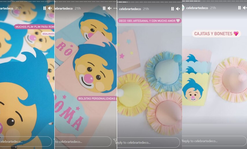 El resultado fueron fichas de madera con stickers del payaso Plim Plim y otros personajes, que fueron entregados en cajas de madera y bolsas que tenían estampado el nombre de la hija de Dalma con el fondo de un circo.