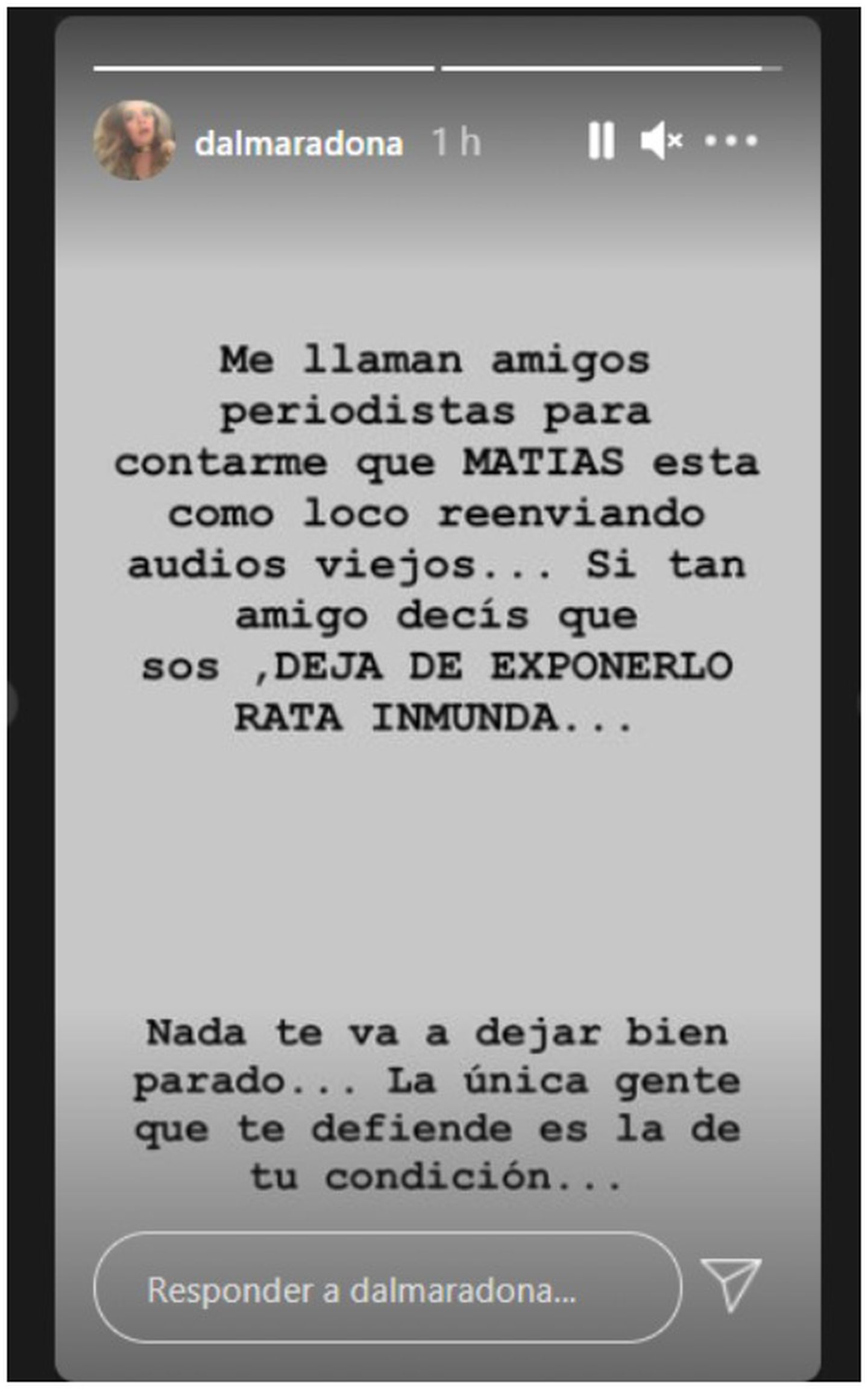 En un segundo posteo acusó a Morla de filtrar material relacionado de Maradona: “Me llaman amigos periodistas para contarme que Matías está como loco reenviando audios viejos”, sostuvo.