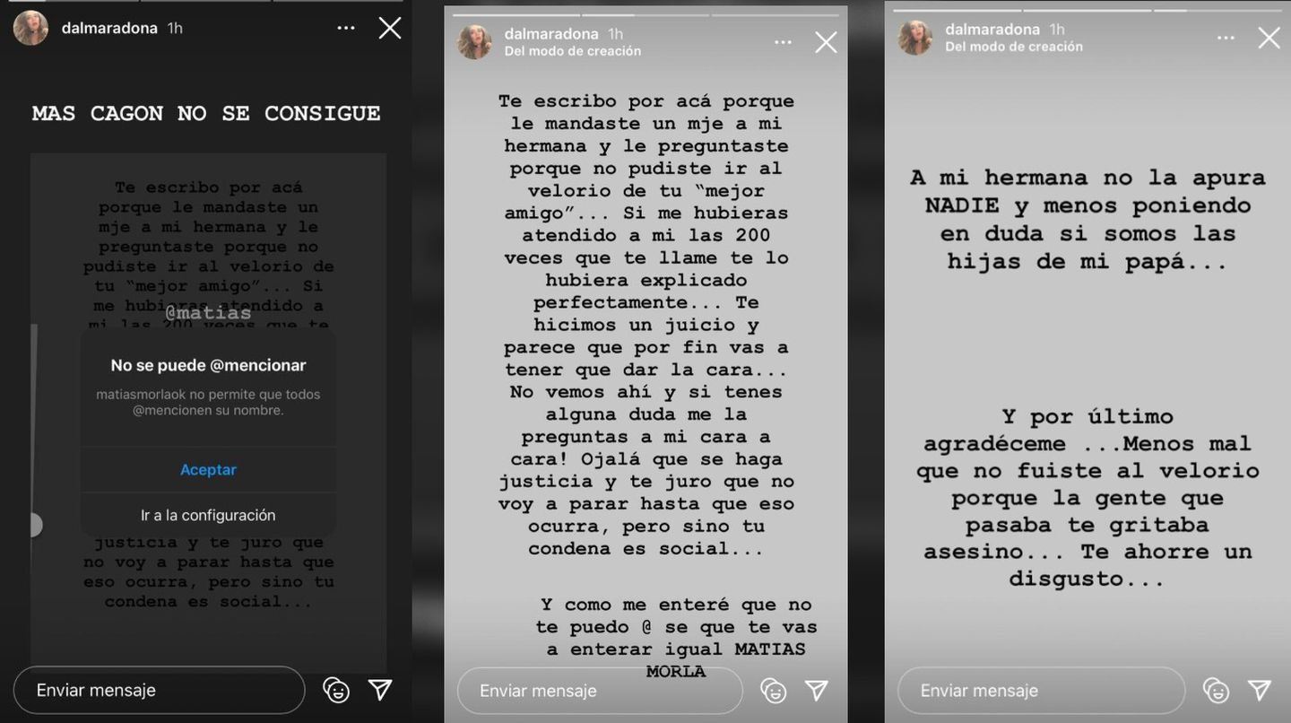 Al igual que hizo el domingo luego de que trascendiera un audio donde el abogado le habla a Gianinna Maradona y, entre otras cosas le reclama por no haber podido estar presente en el velatorio de Diego, Dalma volvió a acudir a sus historias de Instagram para hacer un descargo.