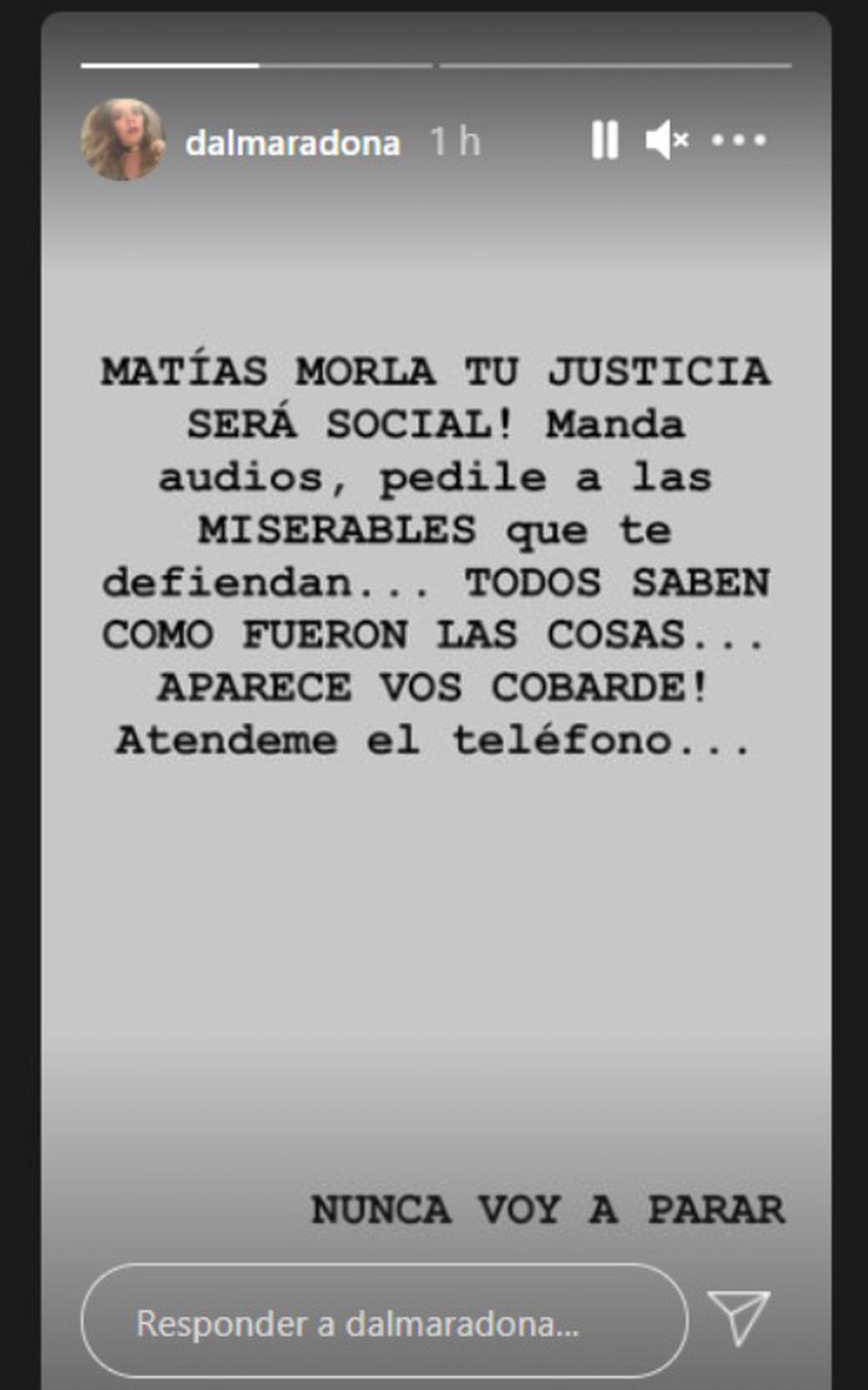 “Matías Morla ¡tu justicia será social! Mandá audios, pedile a las miserables que te defiendan. Todos saben como fueron las cosas. Aparecé vos, cobarde. Atendeme el teléfono. Nunca voy a parar”, escribió la actriz en una historia en su cuenta.