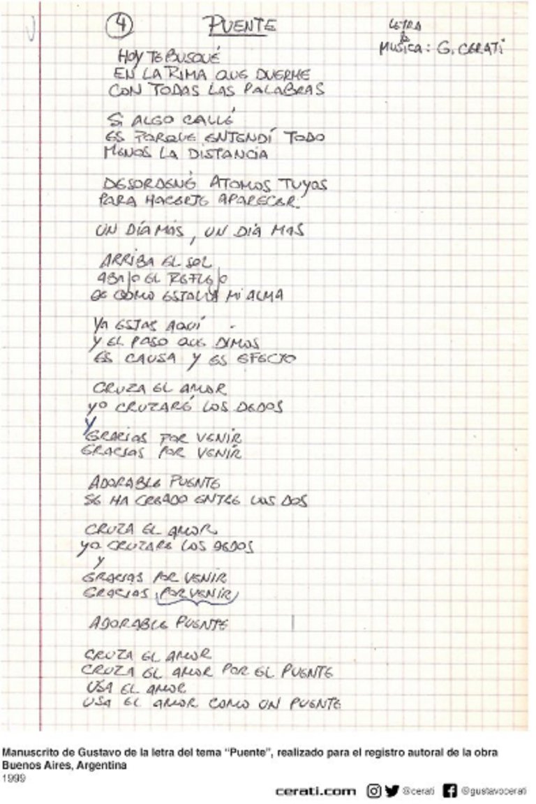 En el posteo -que obtuvo más de 10 mil interacciones- lleva la foto de la hoja en la que la leyenda del rock nacional escribió a mano, por supuesto, “Puente”. Según se lee en el material, fue realizado para el registro autoral de la obra de Buenos Aires, Argentina. “Letra y música: Gustavo Cerati”, escribió el propio artista en 1999.