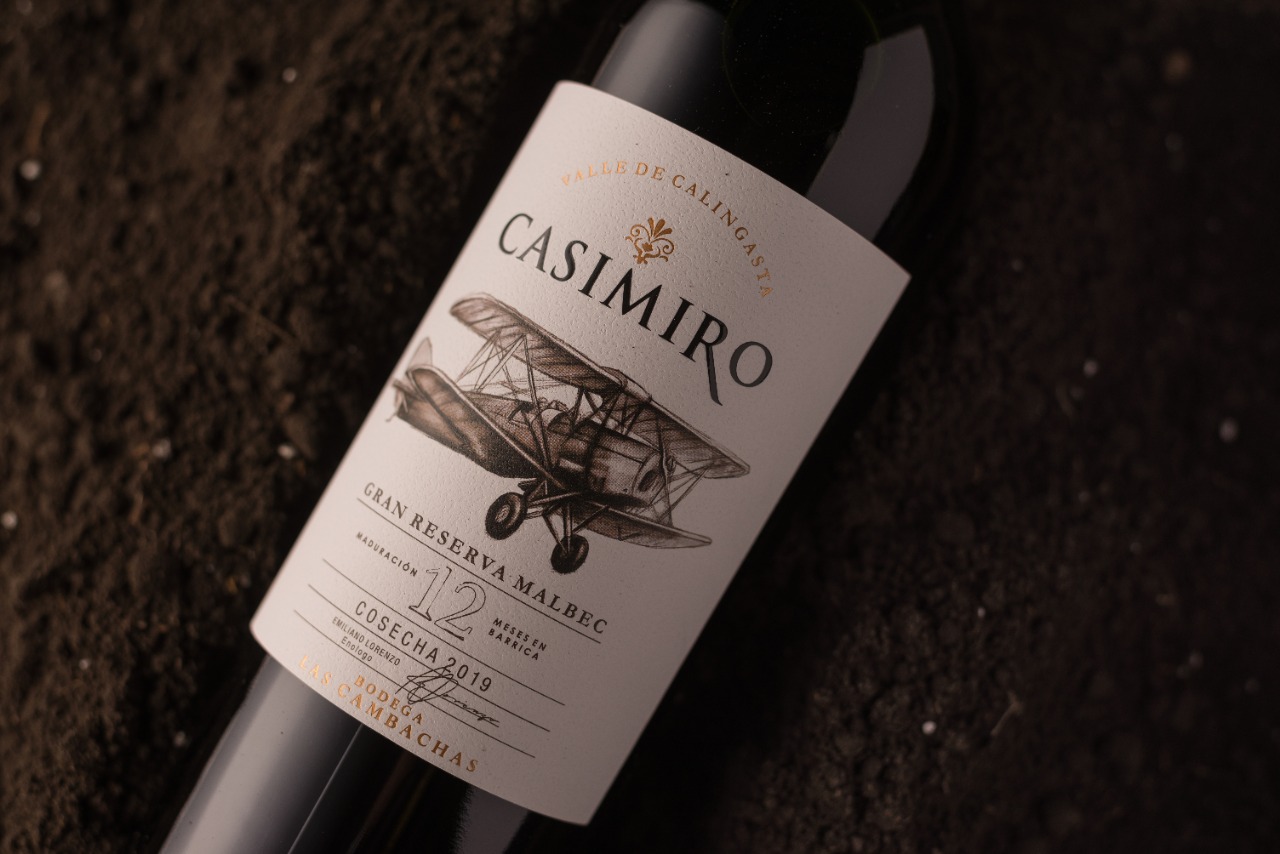 La etiqueta de Casimiro conserva el avión que presenta en todos sus productos, aunque siempre con destacados que evidencian detalles del vino. En este caso, la diseñadora Valeria Diumenjo, es la encargada de aportar el diseño general y los toques diferenciales en un estilo limpio y conceptual para cada línea de esta bodega.