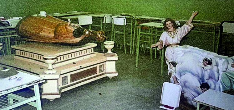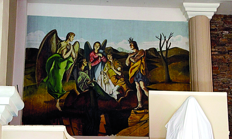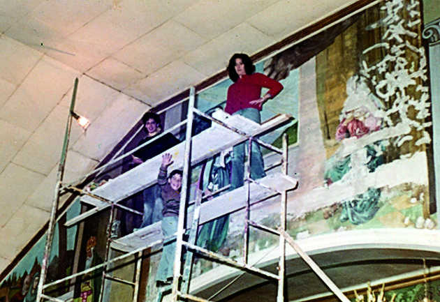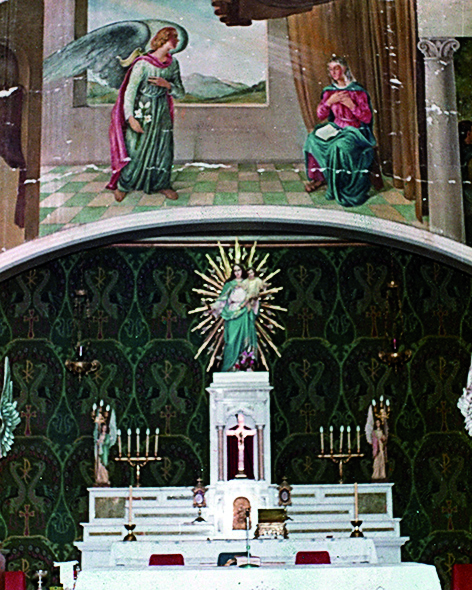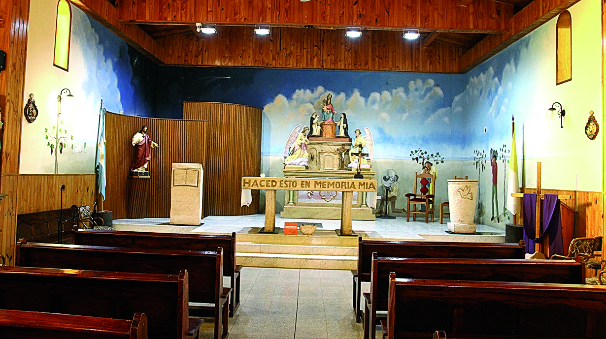 Varios memoriosos recordarán el mural que estaba en el altar de la Parroquia María Auxiliadora (Colegio Don Bosco). Durante décadas esas escenas bíblicas acompañaron a los fieles. Fue restaurado por Estela María Belvideri (fallecida en 2004), entre 1987 y 1988 (foto), pero tiempo después lo borraron. Actualmente (derecha) no hay rastros de ese mural.