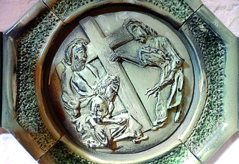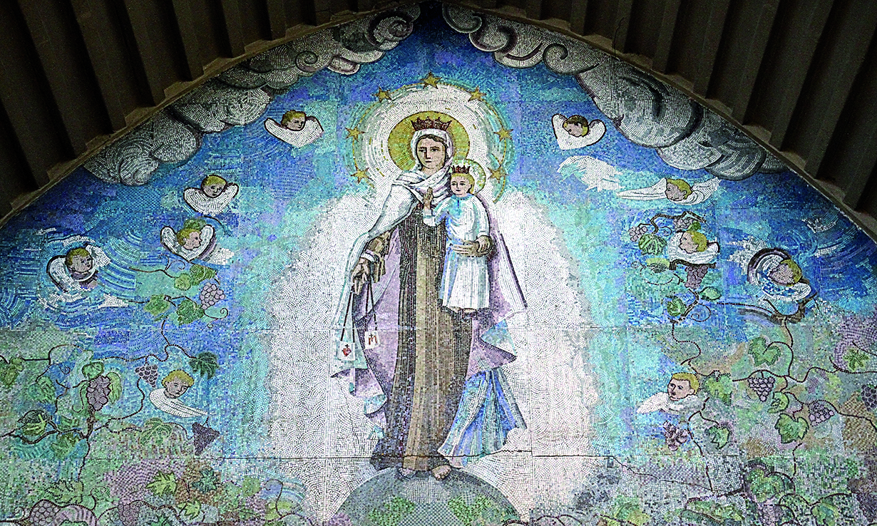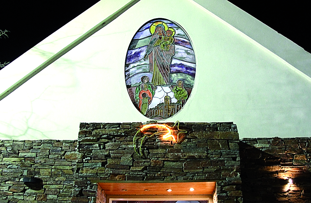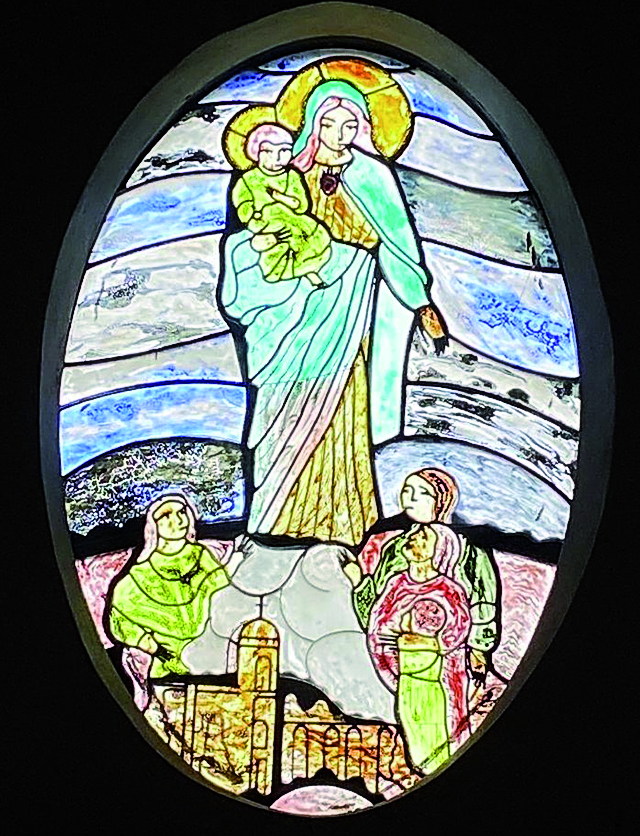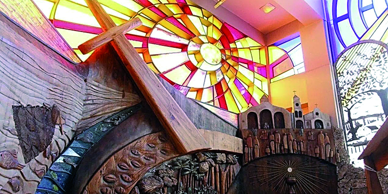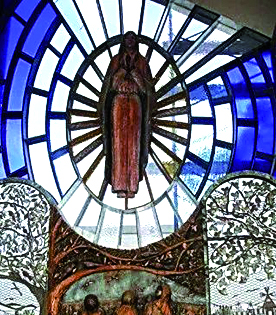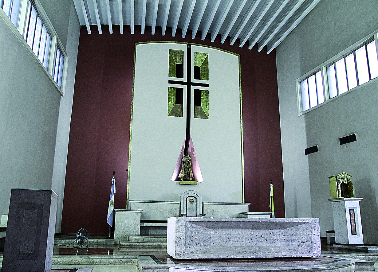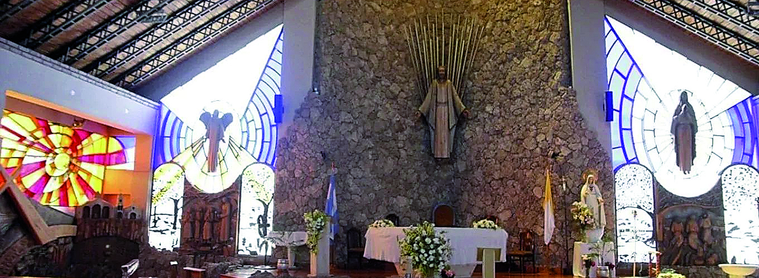La instalación que embellece el altar del Santuario de Fátima es de Mirta Romero, confeccionada en madera, hierro batido y soldado y vitrofusión.