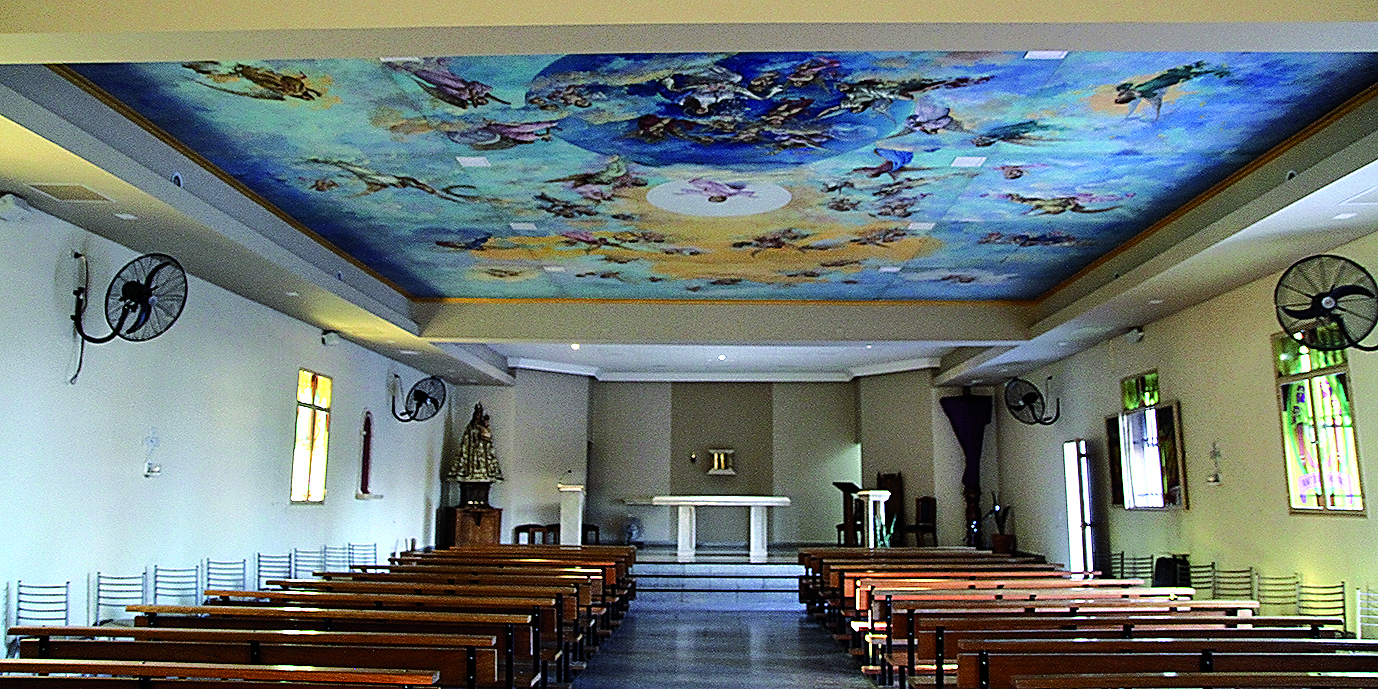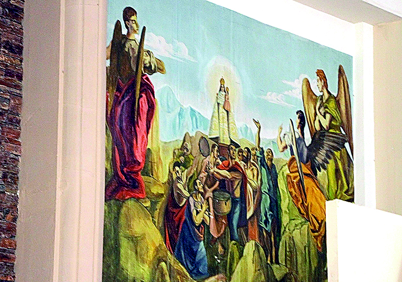 Afuera, un Jesús resucitado de estilo medieval, realizado en cemento con estructura de hierro, parece dar la bienvenida al interior, donde se luce el mural. "La idea fue mía. Sí me pidieron que hiciera alusión a agricultores, ya que Nuestra señora de Pompeya es patrona de los agricultores, por eso hay escenas de viñas, de vendimia. Pero hacia arriba el cielo se transforma como en una noche, hay estrellas y galaxias, que es muy de la temática mía. Está pintado en látex como fondo y ajustes de detalles en óleo.