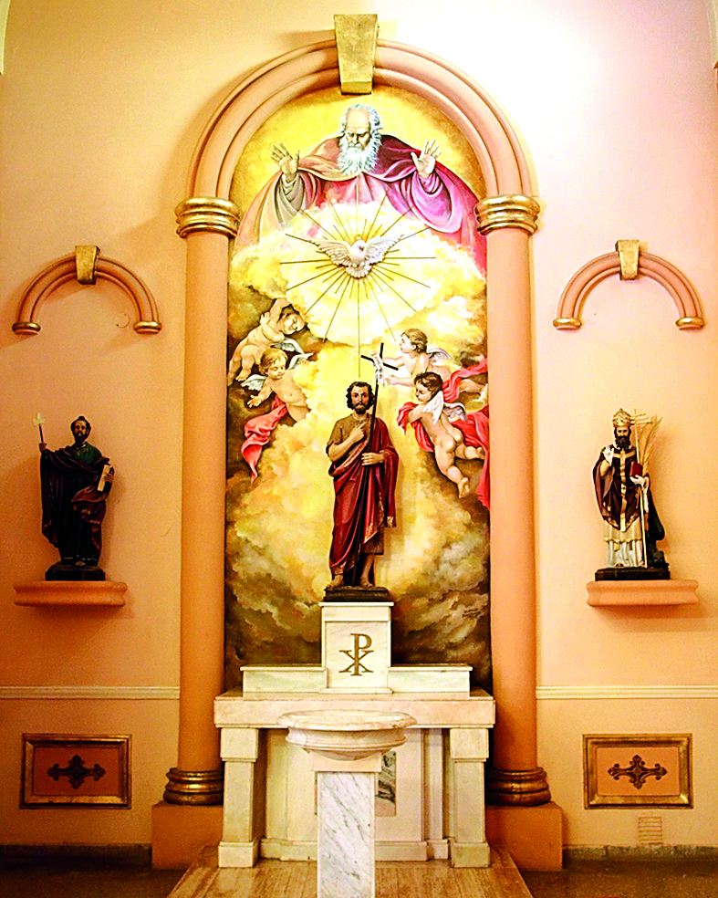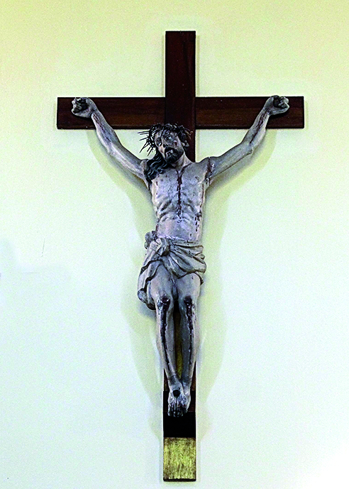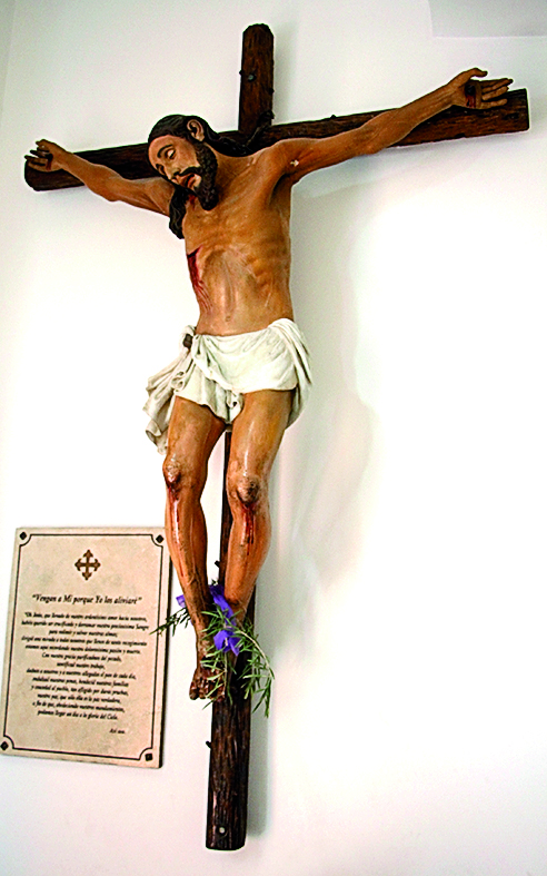Debajo de la Virgen, un Cristo crucificado muy especial, que rescataron de un arcón en la Cripta de la Catedral. Estaba lleno de brea, lo lavaron y "nos encontramos con un encarnado original, trabajo que se hacía en España en el 1900. Debe ser de las obras más antiguas que hay en San Juan y de mayor valor. Le hicimos la cruz de nuevo. Es un Cristo español del 1900, de muy buena talla, no sé cuántos habrán entrado aquí", agregó Leonor.