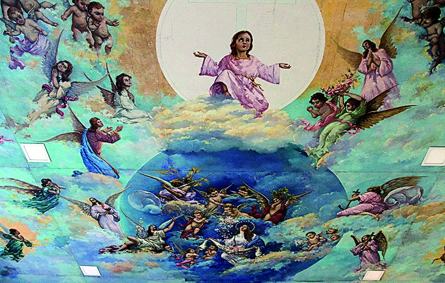 Al ingresar a la parroquia, es imposible no levantar la vista y quedar atrapado en esa imagen celestial. Se trata de la obra "Motivo Eucarístico", de 9×8 metros, pintada por el artista español radicado en San Juan Miguel Marín Ibañez, nacido en Valencia el 29 de marzo de 1888. La obra, que es un conjunto de paños, se hizo para la nueva Catedral de San Juan, pero nunca se instaló.