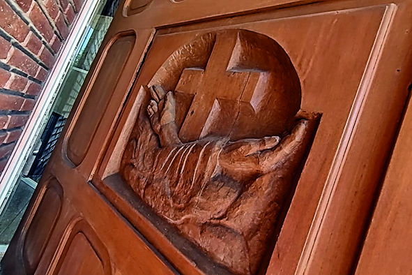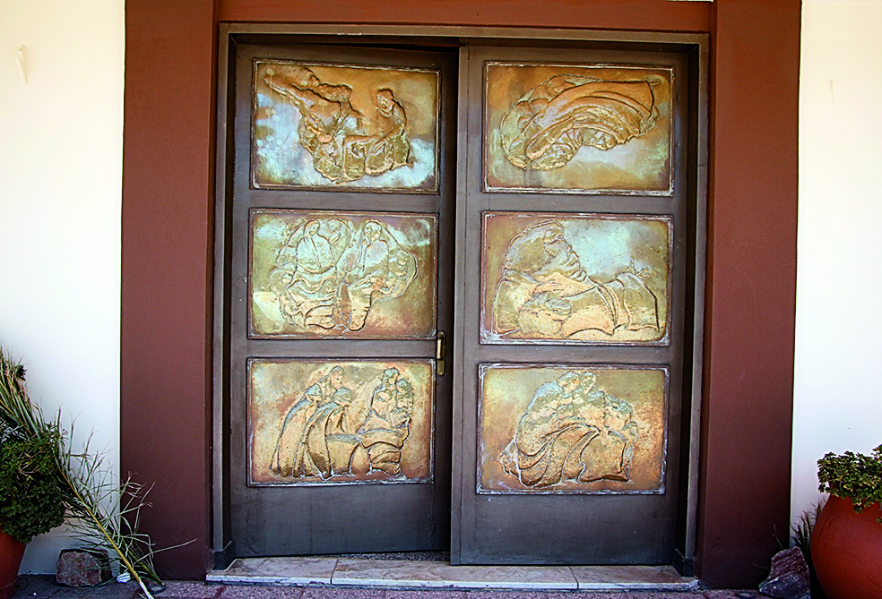Otra de las joyas de esa parroquia, en la que también hicieron las rejas del coro, son las puertas de ingreso, de las que se ocupó Roso. "Fueron realizadas en chapas de bronce, con un procedimiento artesanal, grabado primero el diseño con ácido y luego repujado. Tuve la importante colaboración de Adela Cortínez de Suárez Jofré, grabadora, que me asesoró en grabar las chapas. Y en cuanto al tema, son escenas de la vida de la Virgen, basadas en la iconografía tradicional española de los siglos XIV, XV y XVI", precisó.