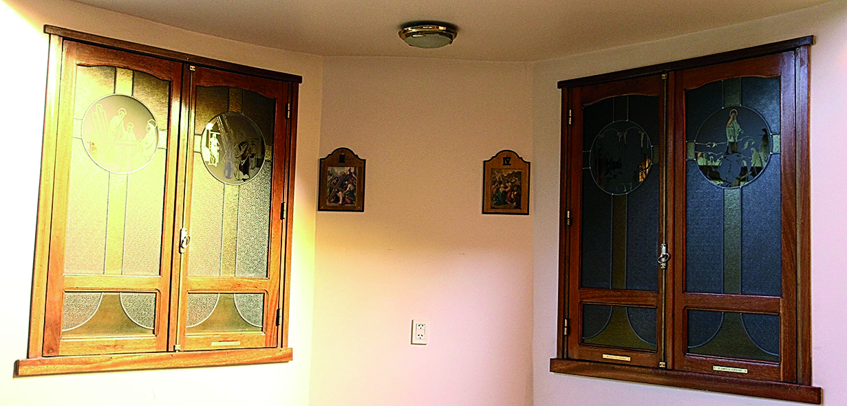 En el interior de la parroquia, hay una obra que Emilio Moya realizó con colaboración de Alberto Sánchez Maratta. "Sí, podría decirse que son vitrales que llevan imágenes en vidrio esmerilado, escenas o pasajes de la vida de Cristo", comentó Moya a DIARIO DE CUYO. "Están grabadas en cristales espejados. Donde se graba la escena en sí es como si fuera la hostia, y en un diseño como si fuera un copón. Cada escena está en una hoja de una ventana, a los costados del altar central. Hicimos por ejemplo la multiplicación de panes, el lavado de pies, la crucifixión y la resurrección, entre otras. No es vía crucis", apuntó el artista y arquitecto, que ha realizado también sagrarios y pilas bautismales para otras iglesias.