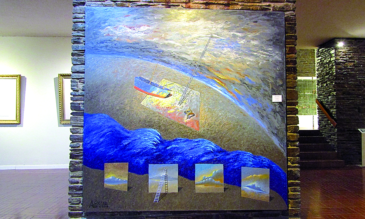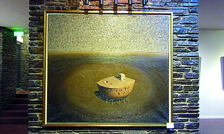 En la Cripta de la Catedral San Juan Bautista, se exhiben varias pinturas de autores foráneos, incluso las que conforman las estaciones del vía crucis. Pero apenas se ingresa, colgadas en dos grandes muros centrales, hay de artistas sanjuaninos. Una es Proyecto para un diluvio, autoría de Arturo Sierra, un óleo sobre tela de 183 x 184 cm (foto derecha). La otra (foto izquierda) es Esperando un sueño, un óleo sobre tela del célebre artista local ya fallecido Mario Pérez, que mide 133 x 150 cm. Ambas obras de arte pertenecen a un coleccionista privado de la provincia, pero se exhiben hace tiempo allí en calidad de préstamo. "Y quizás sea por tiempo indeterminado", acotó Sierra, complacido de tener una creación suya exhibida en el principal templo de la provincia.