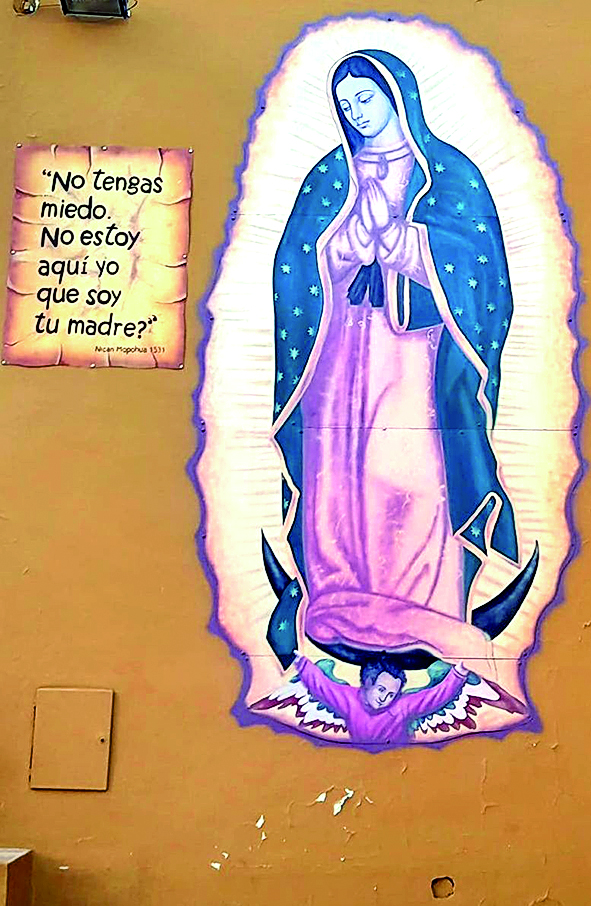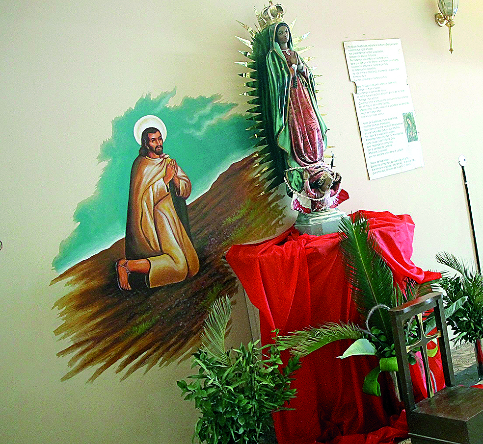 "En la parroquia de Guadalupe pintamos con mi esposa Elizabeth Leguizamón la Virgen de Guadalupe. Es un gran mural que tiene un tamaño de 5 metros de alto aproximadamente y está ubicado en el muro oeste del frente de la parroquia. Está pintada con esmaltes al agua sobre chapa", contó a este medio Claudio Domínguez, quien se basó en la iconografía tradicional para su diseño. La dupla también es la responsable de otra obra que está en Guadalupe, en el interior: una pintura sobre Juan Diego (el indio chichimeca que presenció la aparición de la Virgen de Guadalupe) realizada en acrílico sobre la pared, en estampas. "Está en la sala anterior al templo. El mural acompaña una escultura de una Virgen, que no es obra mía", agregó. Esa obra se realizó en 2020, fue un trabajo por encargo, se ha convertido en un ícono de la parroquia y es una de sus obras más importantes, según Domínguez, quien relató que desde adolescente ha pintado obras varias para la parroquia de Cristo Rey de Caucete, "principalmente varios de los murales-telones que se usan en la novena de Cristo Rey de noviembre".
