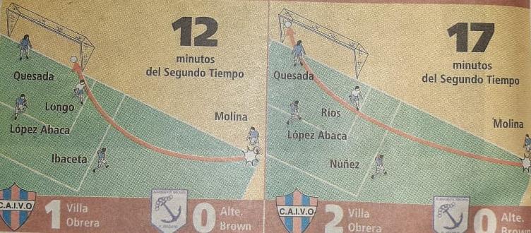 El terror de aquel enfrentamiento ya había quedado atrás y Villa Obrera sabía que ganando de local iba a lograr el pasaje al Argentino A, por lo que la semana previa de entrenamientos era clave. “Trabajamos con “El Luto” (Alfredo) Molina en la pelota parada y yo le dije que el arquero de Guillermo Brown era petisito para que se anime en las pelotas paradas”, detalló el entrenador. Después, cuando llegó el partido, el volante le hizo caso y cumplió a la perfección porque marcó dos golazos olímpicos (ver infografía). El primero fue al palo del arquero, mientras que en el segundo tanto, con la misma fórmula del ullunero, la pelota se metió en el segundo palo.